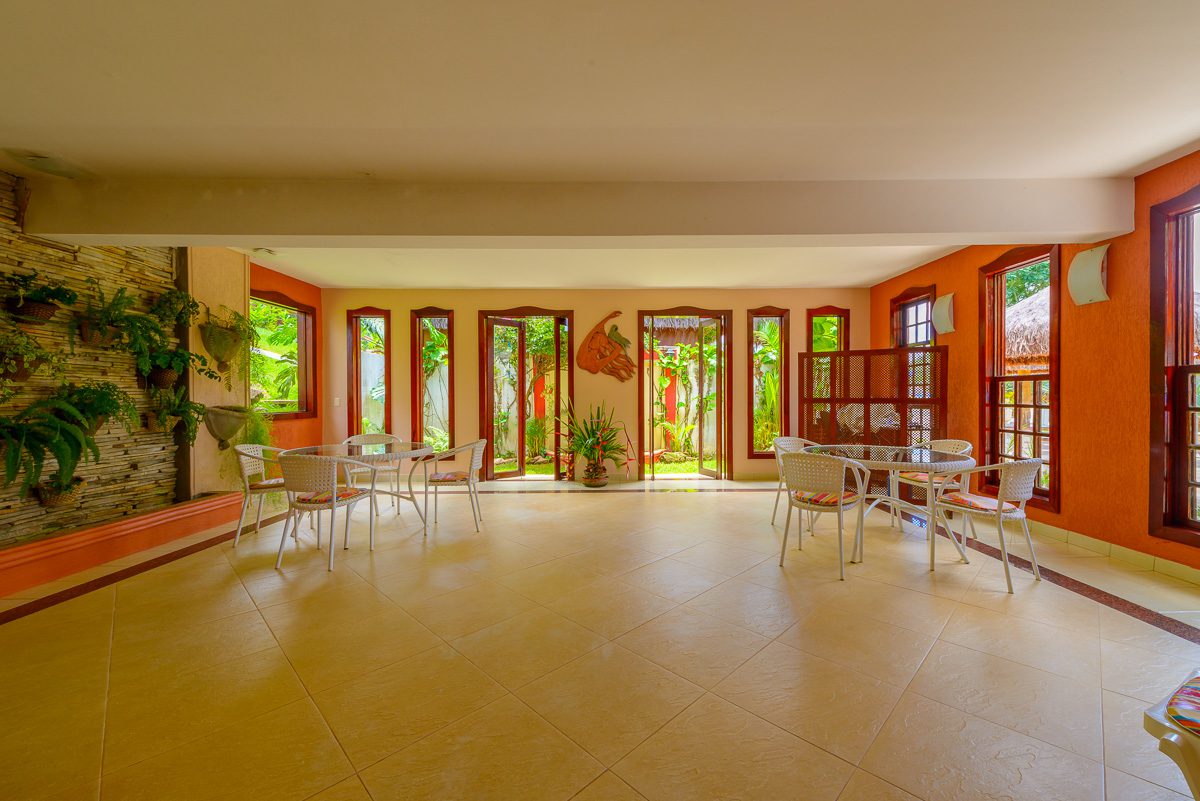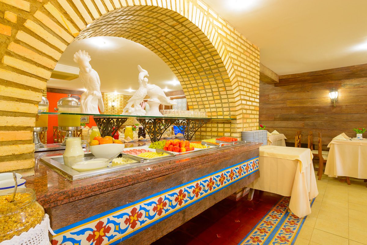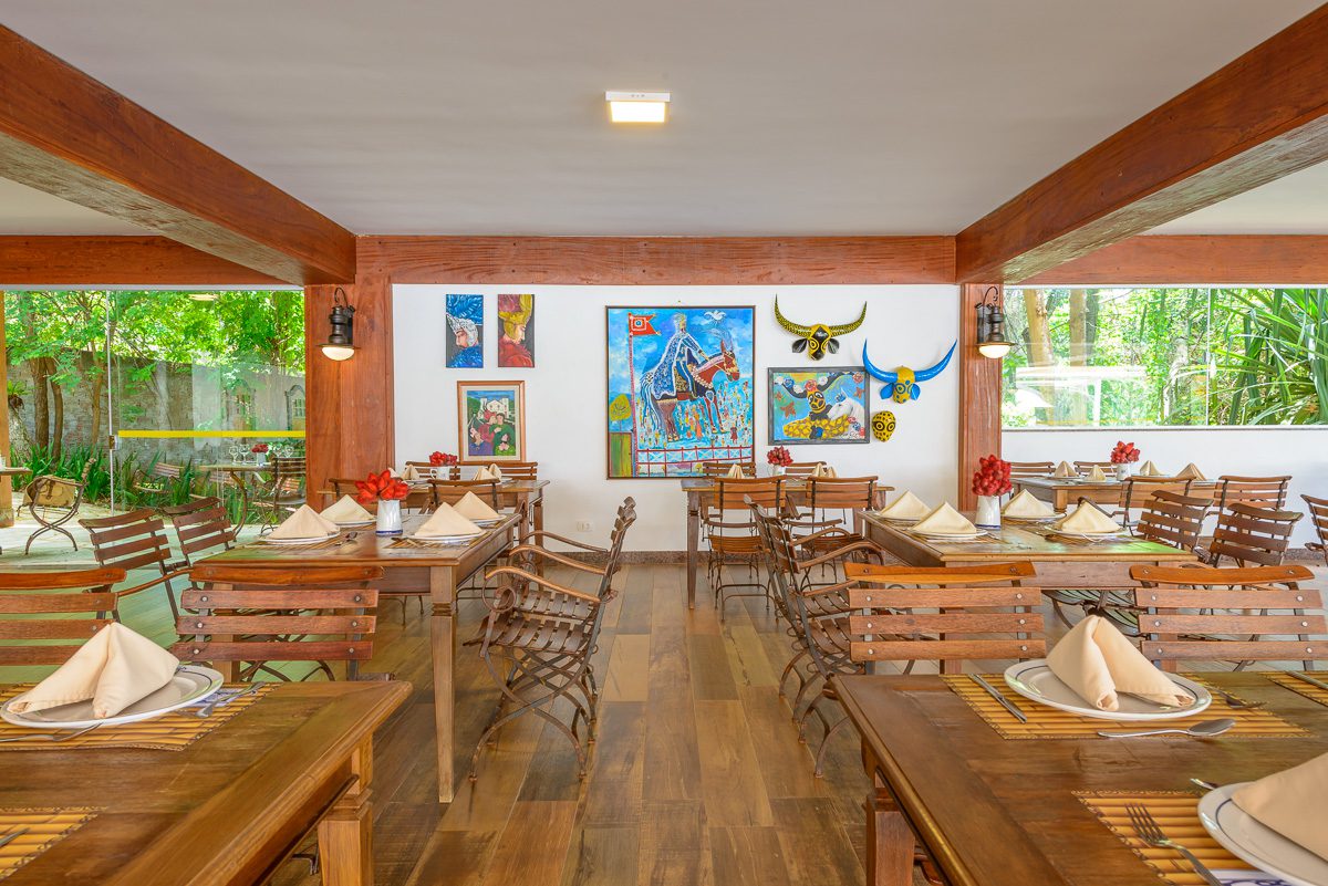 Amplo salão aberto, onde servimos diariamente no estilo buffet nosso famoso café da manhã ao som do piano, e jantares temáticos com sobremesas deliciosas e música ao vivo.