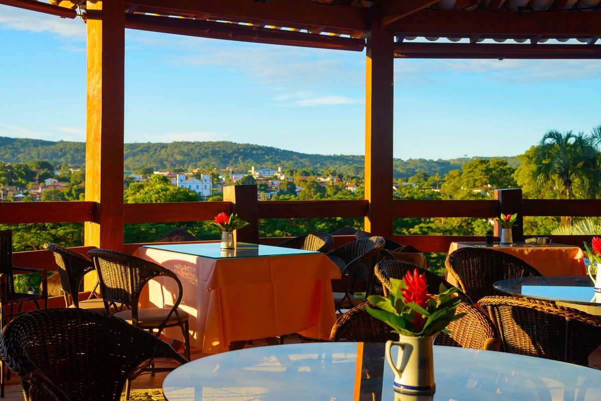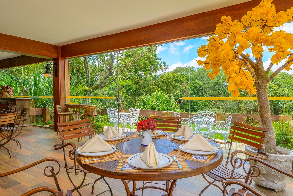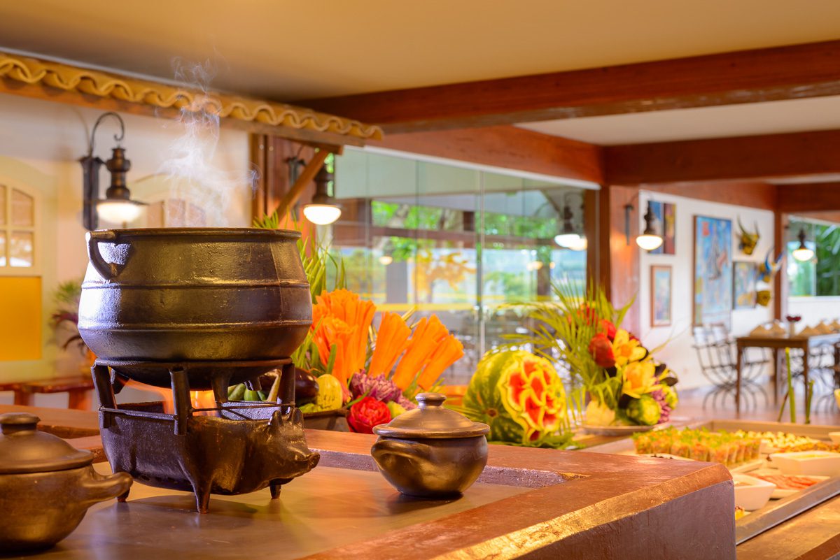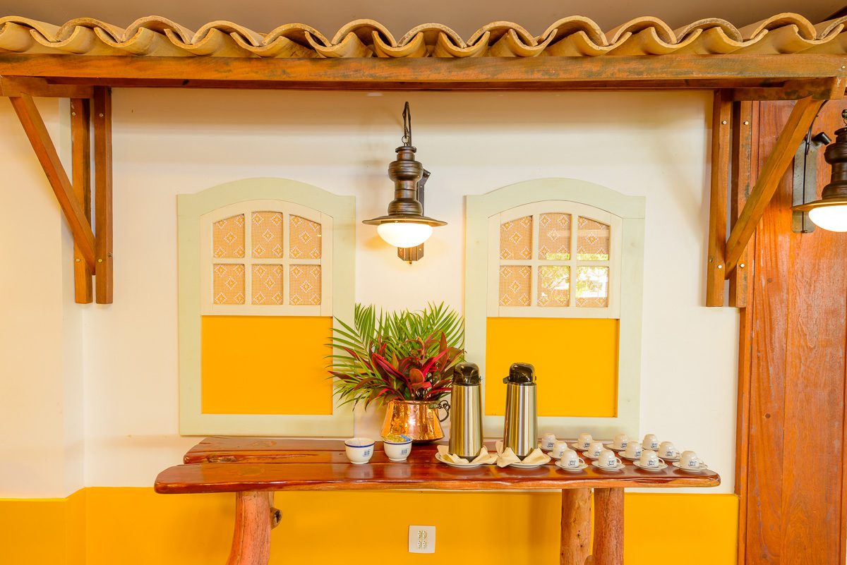 Amplo salão aberto, onde servimos diariamente no estilo buffet nosso famoso café da manhã ao som do piano, e jantares temáticos com sobremesas deliciosas e música ao vivo.