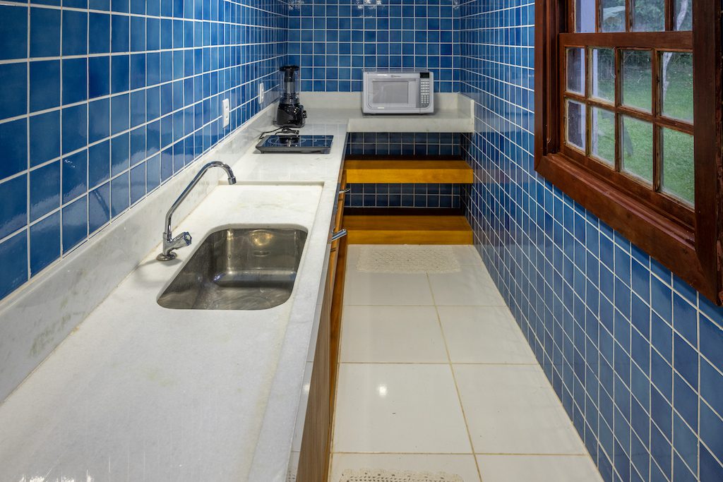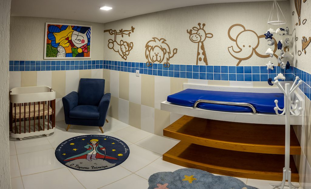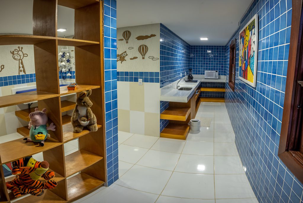 Espaço exclusivo para o preparo das refeições para bebês. O local dispõe de uma bancada com pia para higienização dos utensílios, micro-ondas, liquidificador, berço, trocador e cadeira.